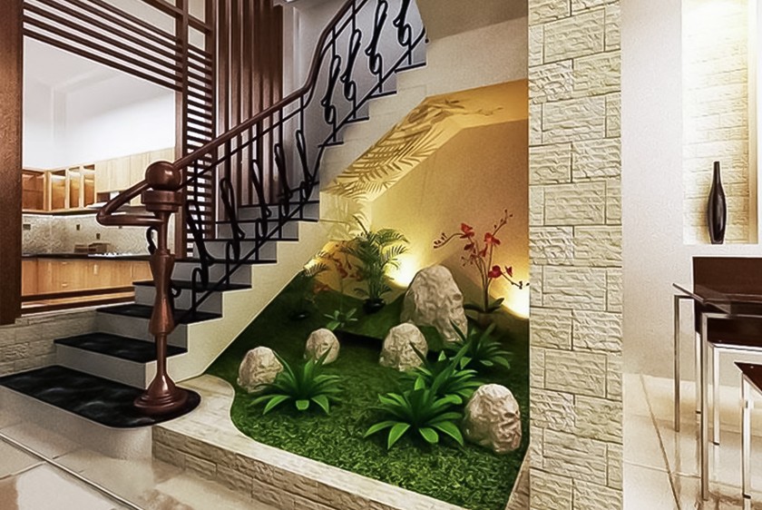 Chúng ta đang sống trong một thời đại những khoảng xanh trong đô thị ngày một khan hiếm. Vậy nên để tiết kiệm diện tích mà vẫn mang cây xanh vào nhà phố, bạn có thể cân nhắc việc đặt những tiểu cảnh, cây xanh dưới gầm hoặc bên cạnh cầu thang.
