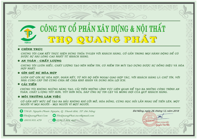 Công ty Cổ Phần xây dựng và nội thất Thọ Quang Phát luôn không ngừng học hỏi, cải thiện và phát triển gây dựng niềm tin vững chắc trong lòng mỗi khách hàng để hoàn thành mọi công trình. cam kết lấy chất lượng, sự uy tín tạo nên thước đo thành công và làm mục tiêu hoạt động sẽ đứng đầu công ty xây dựng tại Đà Nẵng.