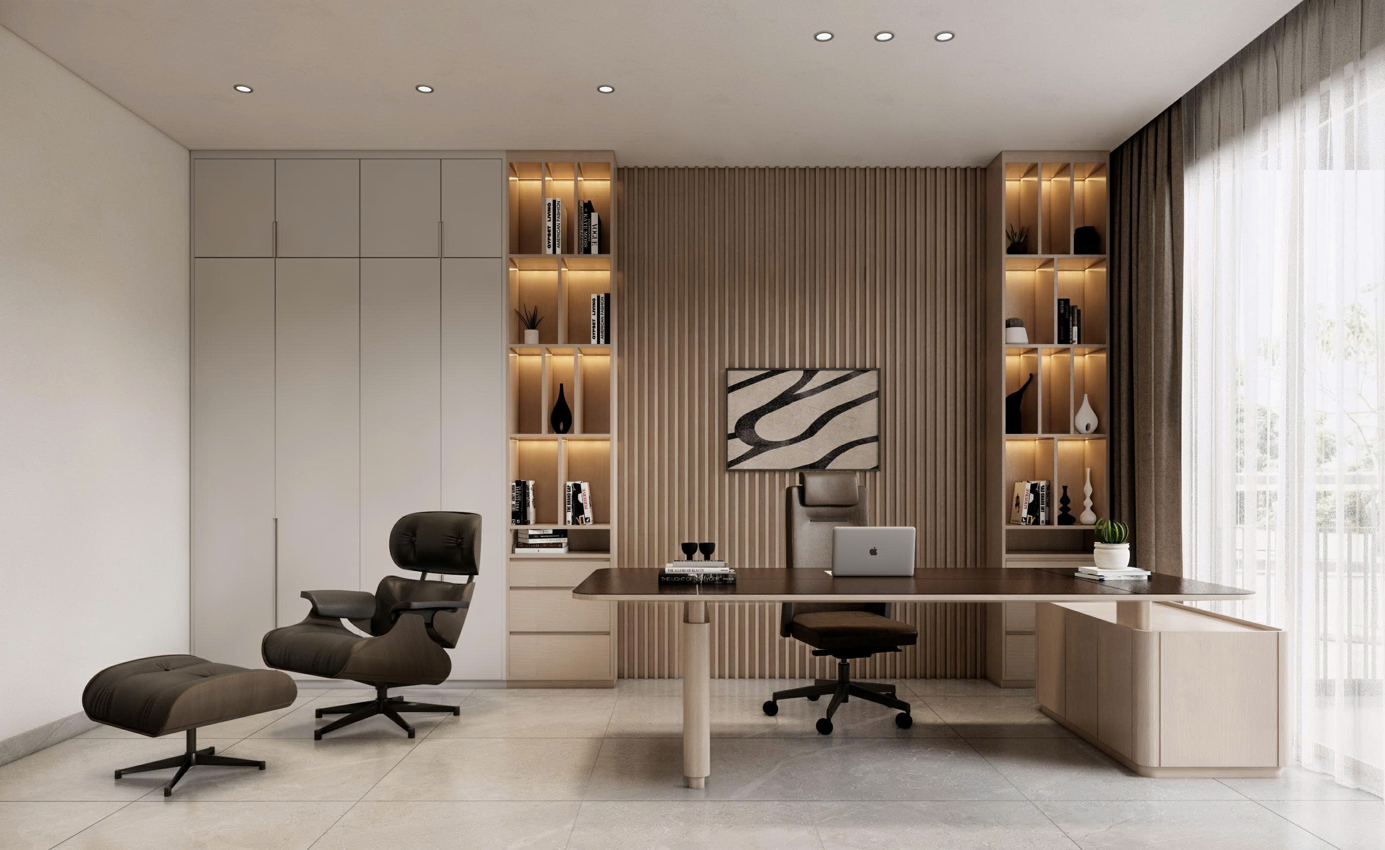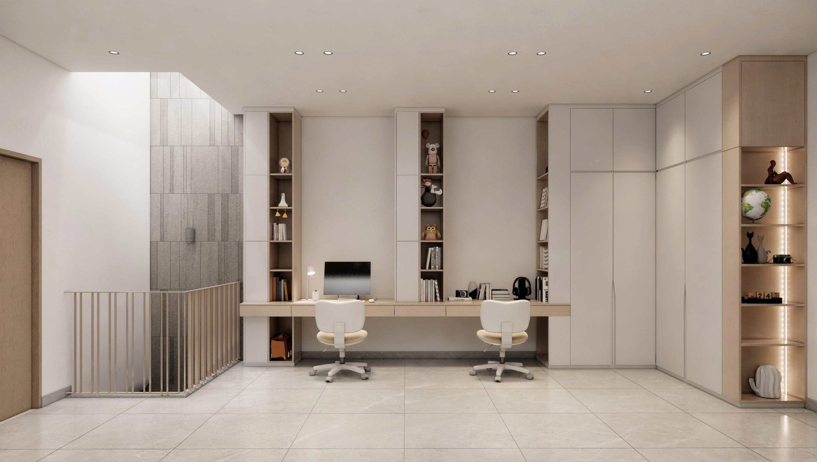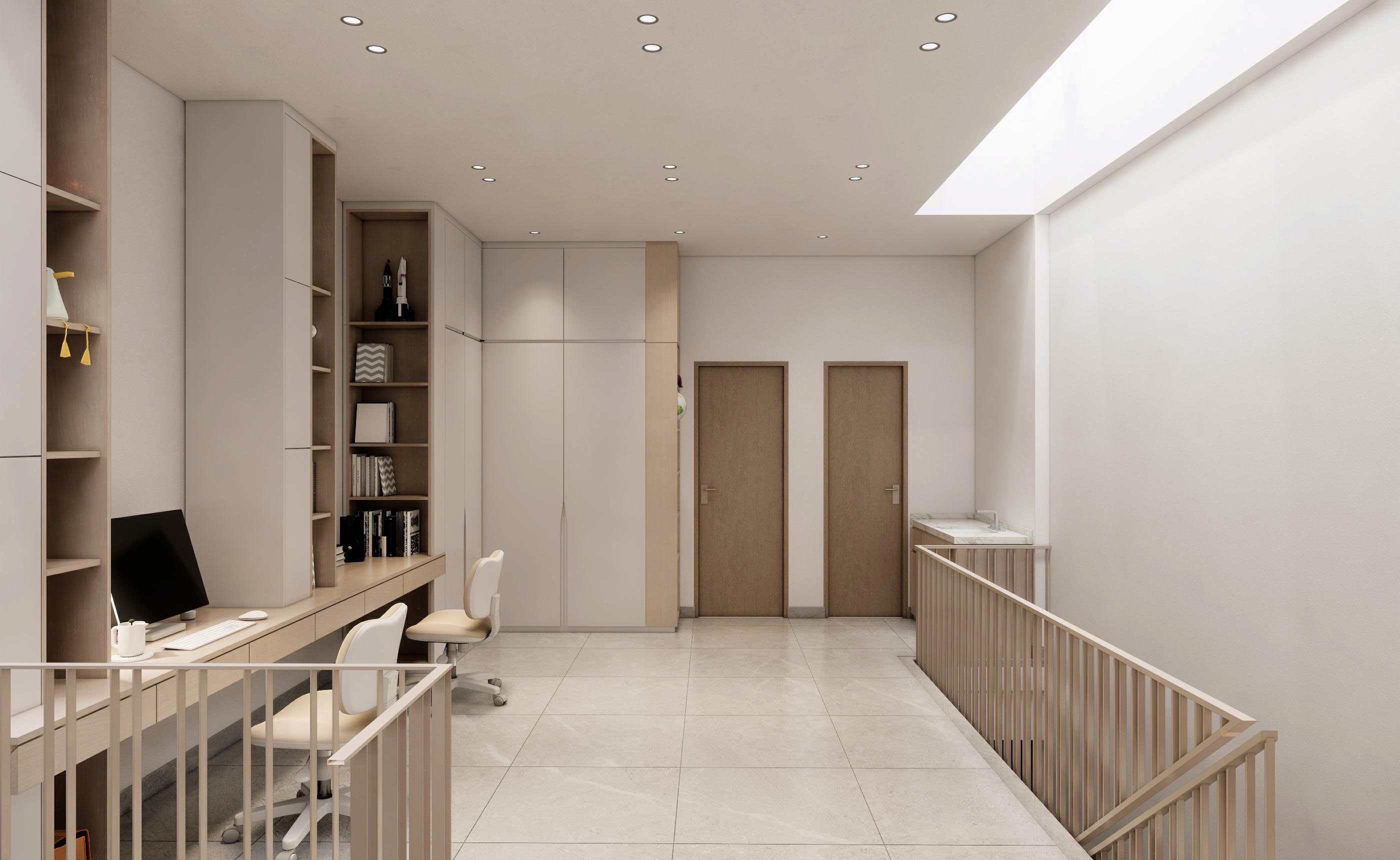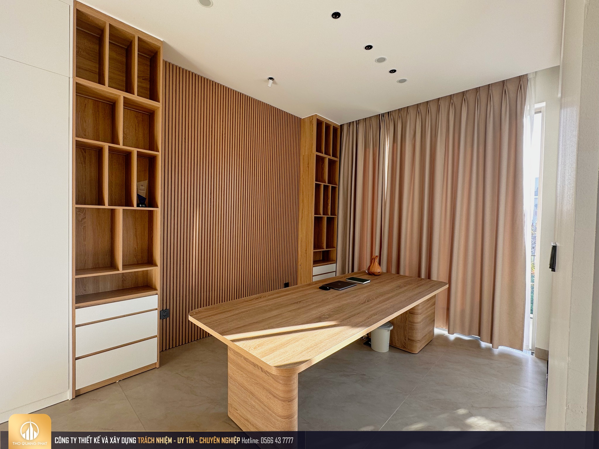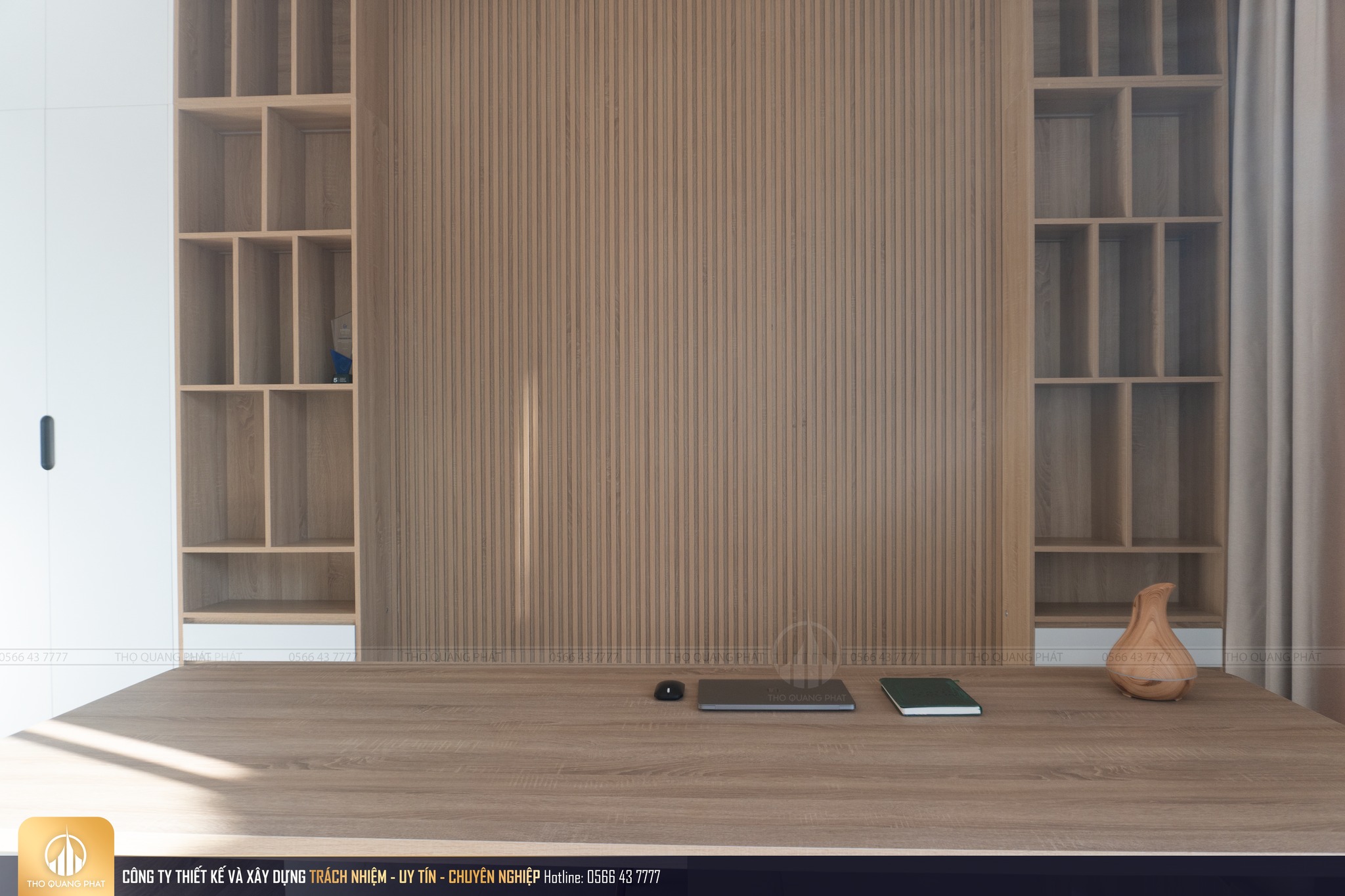 Góc làm việc tại H’s House được thiết kế hiện đại với hệ bàn dài và kệ tủ kịch trần giúp tối ưu hóa không gian lưu trữ chuyên nghiệp. Sự kết hợp giữa tông gỗ sáng và ánh sáng tự nhiên từ khoảng thông tầng tạo nên môi trường làm việc đầy cảm hứng và tinh tế.