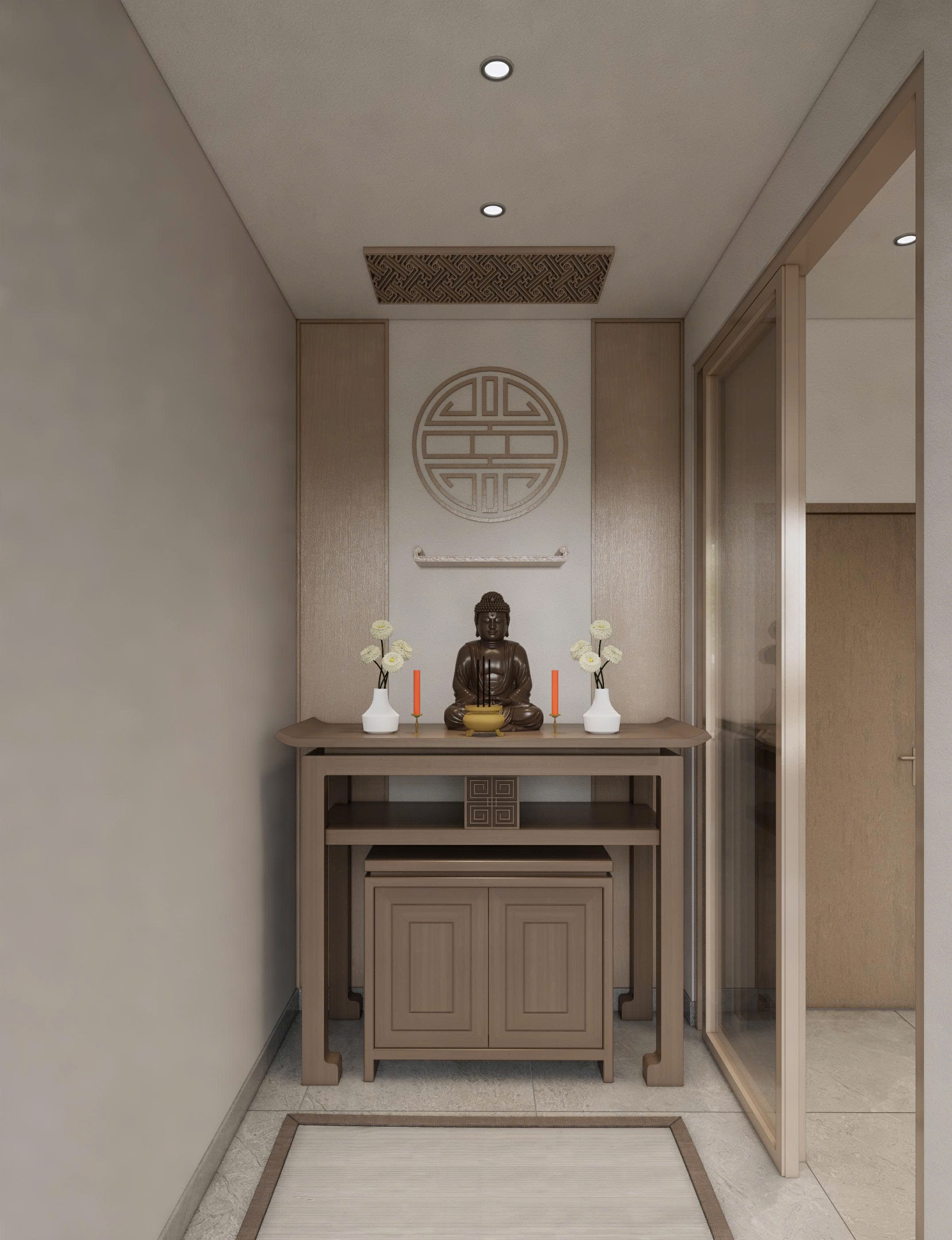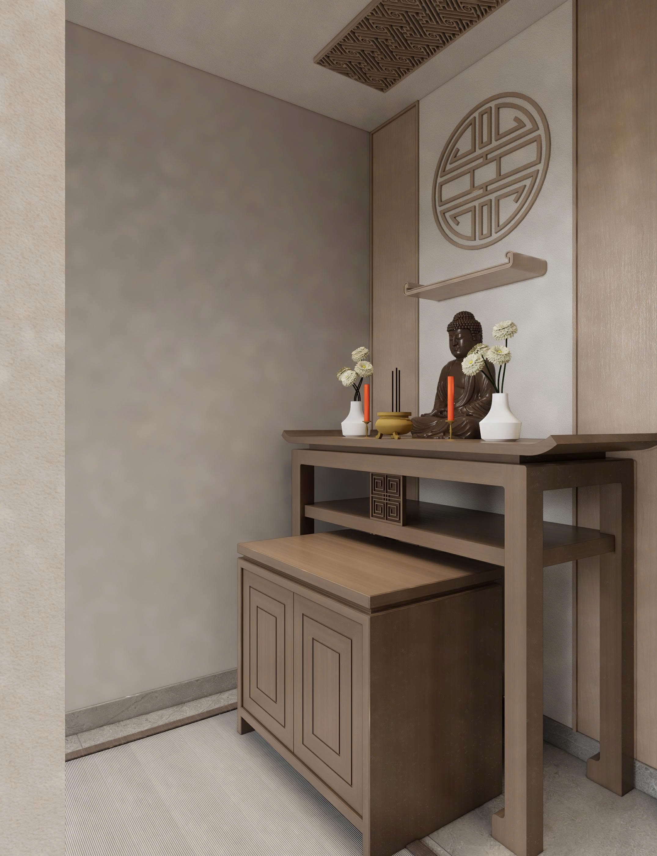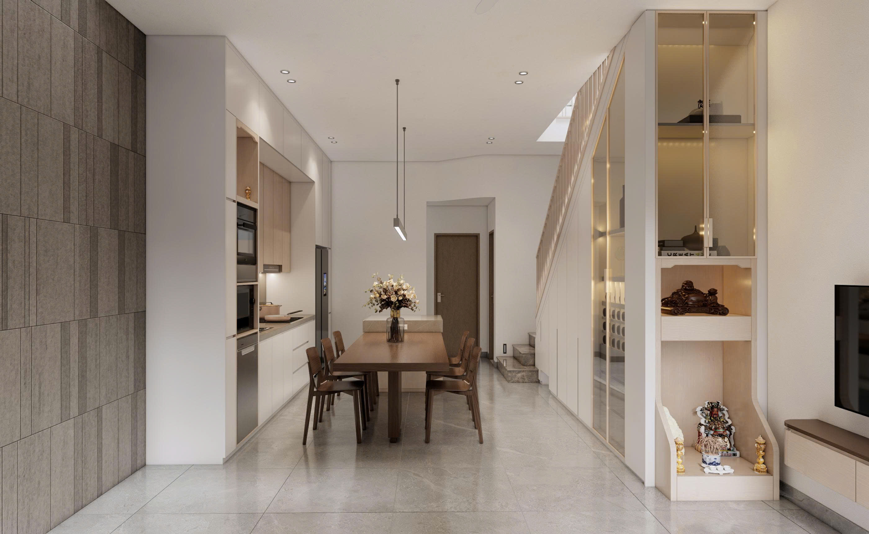Góc thờ tại H’s House được thiết kế trang nghiêm, tích hợp khéo léo vào hệ tủ kịch trần hiện đại để đảm bảo sự riêng tư và tinh tế. Chất liệu gỗ ấm cúng cùng ánh sáng dịu nhẹ tạo nên một không gian tâm linh thành kính, hài hòa hoàn hảo với tổng thể ngôi nhà.