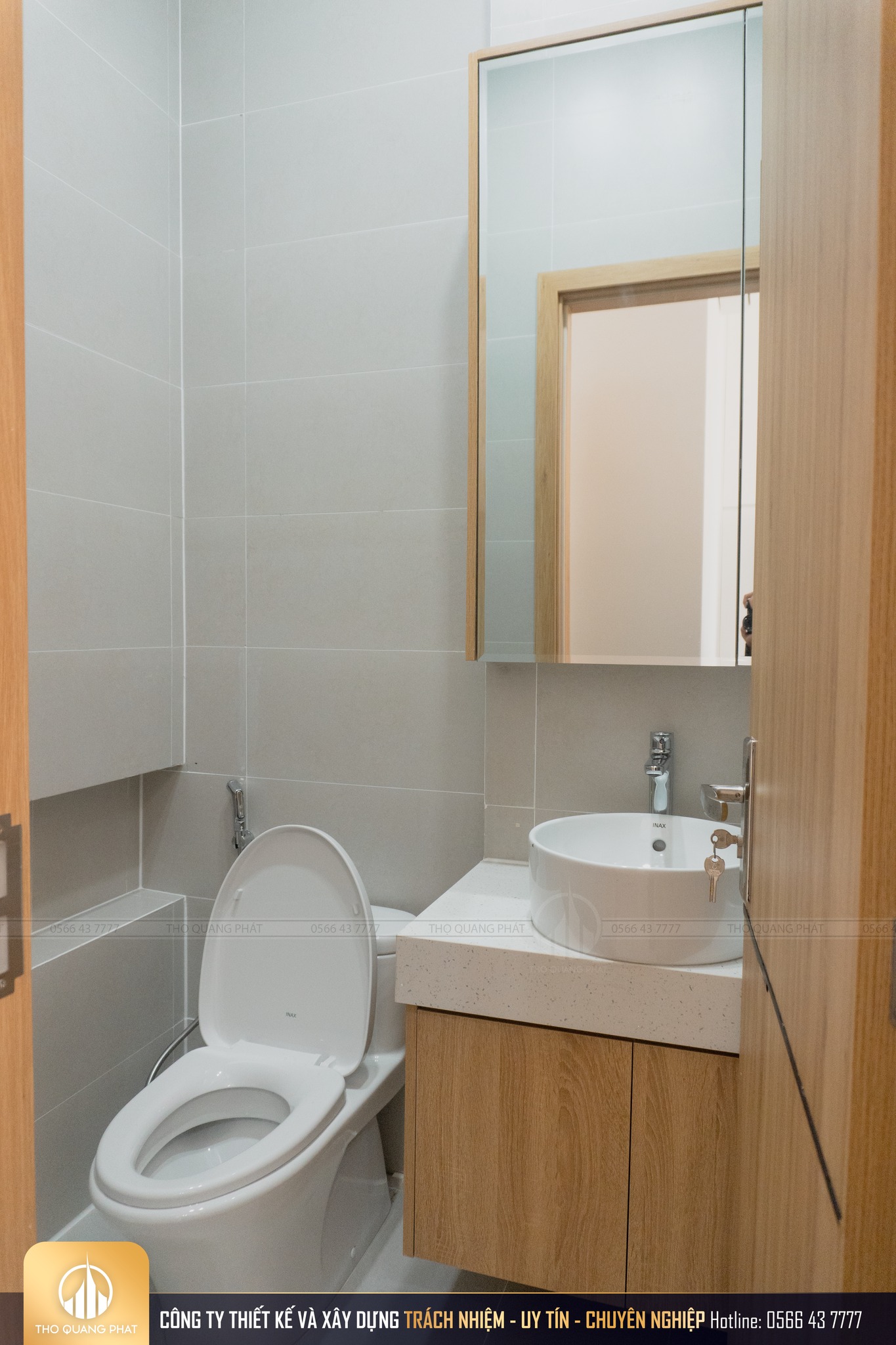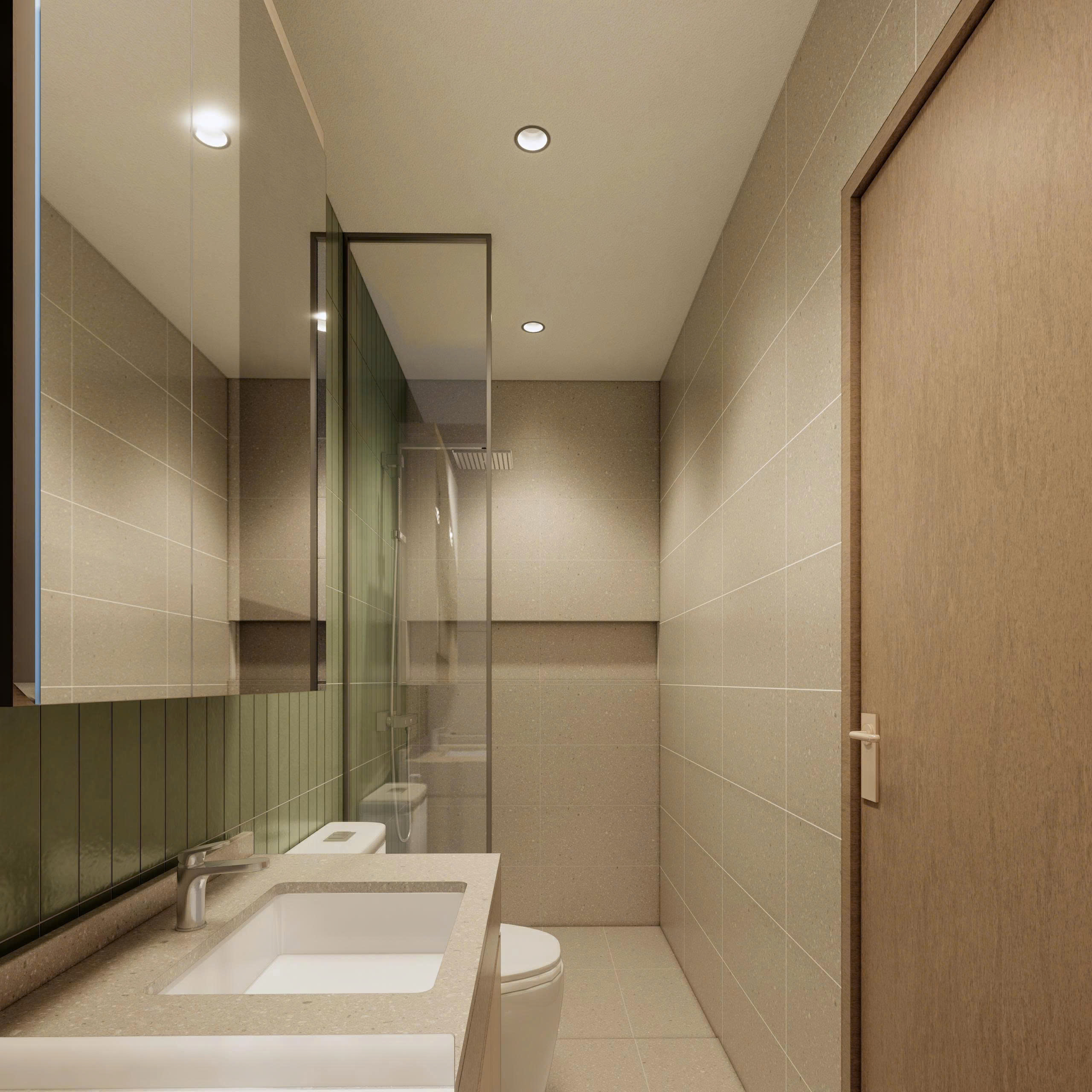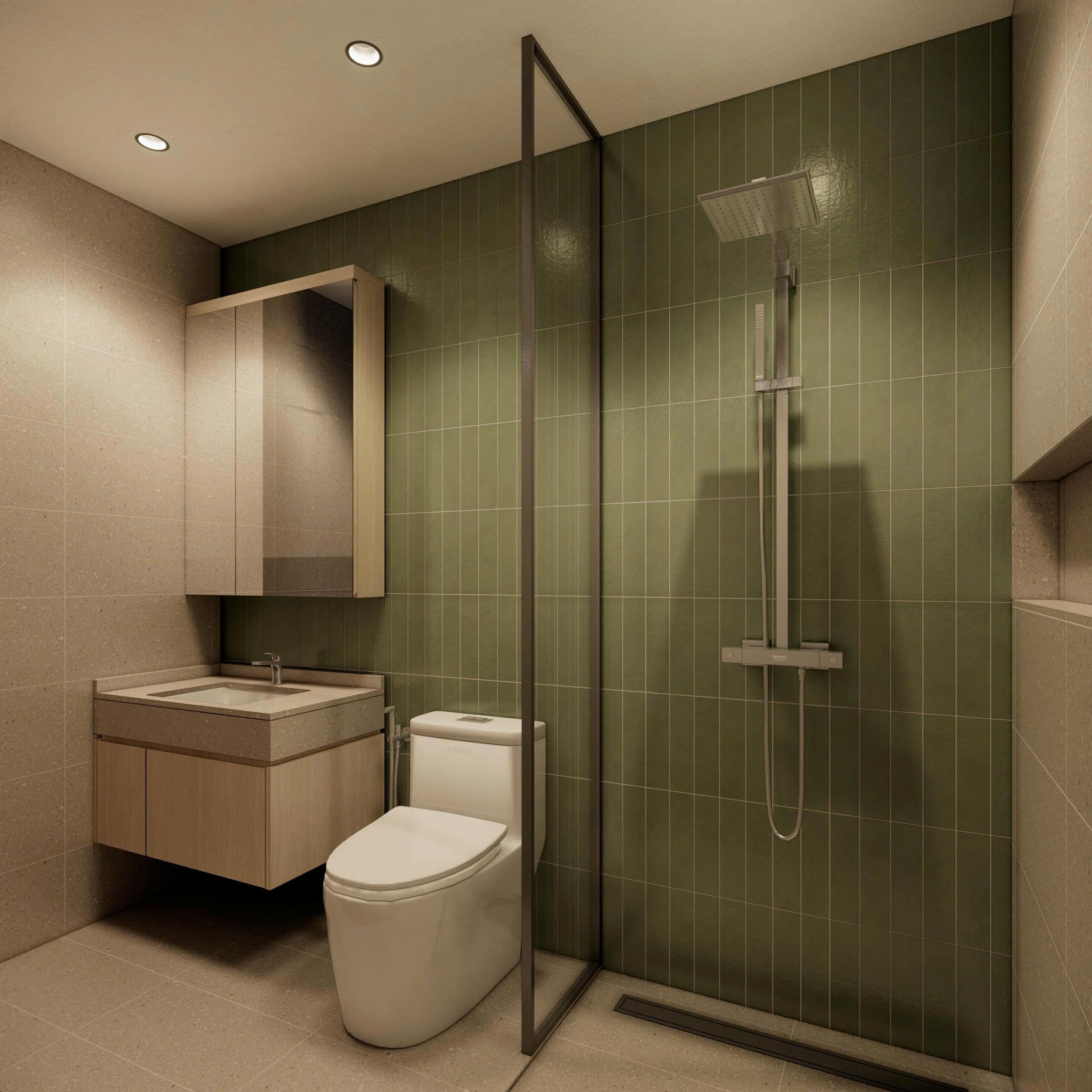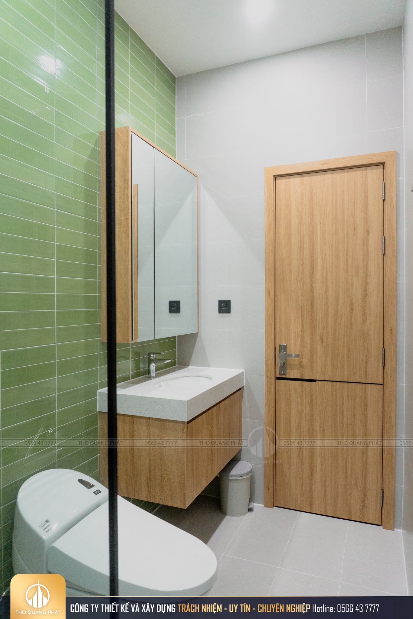Phòng vệ sinh mang phong cách hiện đại với điểm nhấn là mảng tường gạch thẻ màu xanh lá tươi mát, tạo cảm giác thư giãn và gần gũi với thiên nhiên. Không gian được tối ưu hóa công năng nhờ sự kết hợp giữa các thiết bị sứ trắng cao cấp, vách kính tắm đứng ngăn nước và hệ tủ chậu bằng gỗ tinh tế.