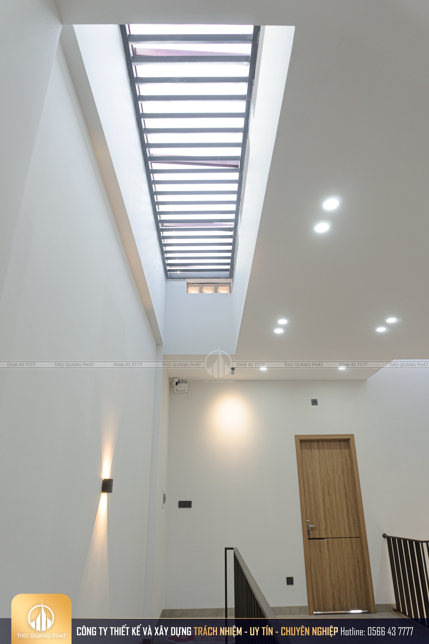 Không gian giếng trời hiện đại với hệ lam lấy sáng tự nhiên, kết hợp đèn âm trần và đèn hắt tường, tạo cảm giác thông thoáng, sáng sủa và tinh tế cho ngôi nhà.