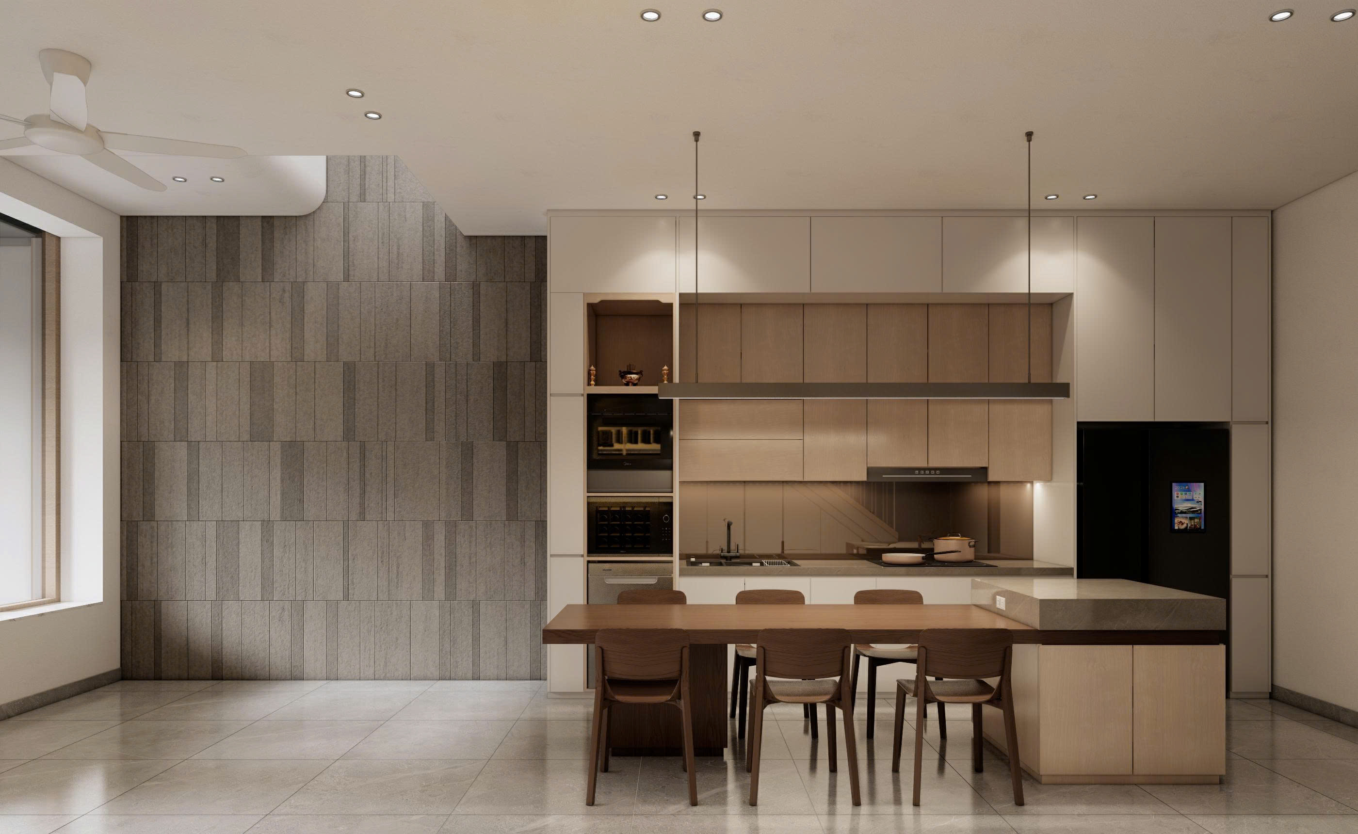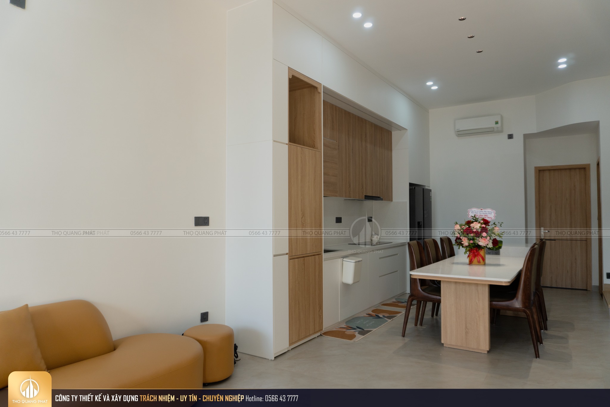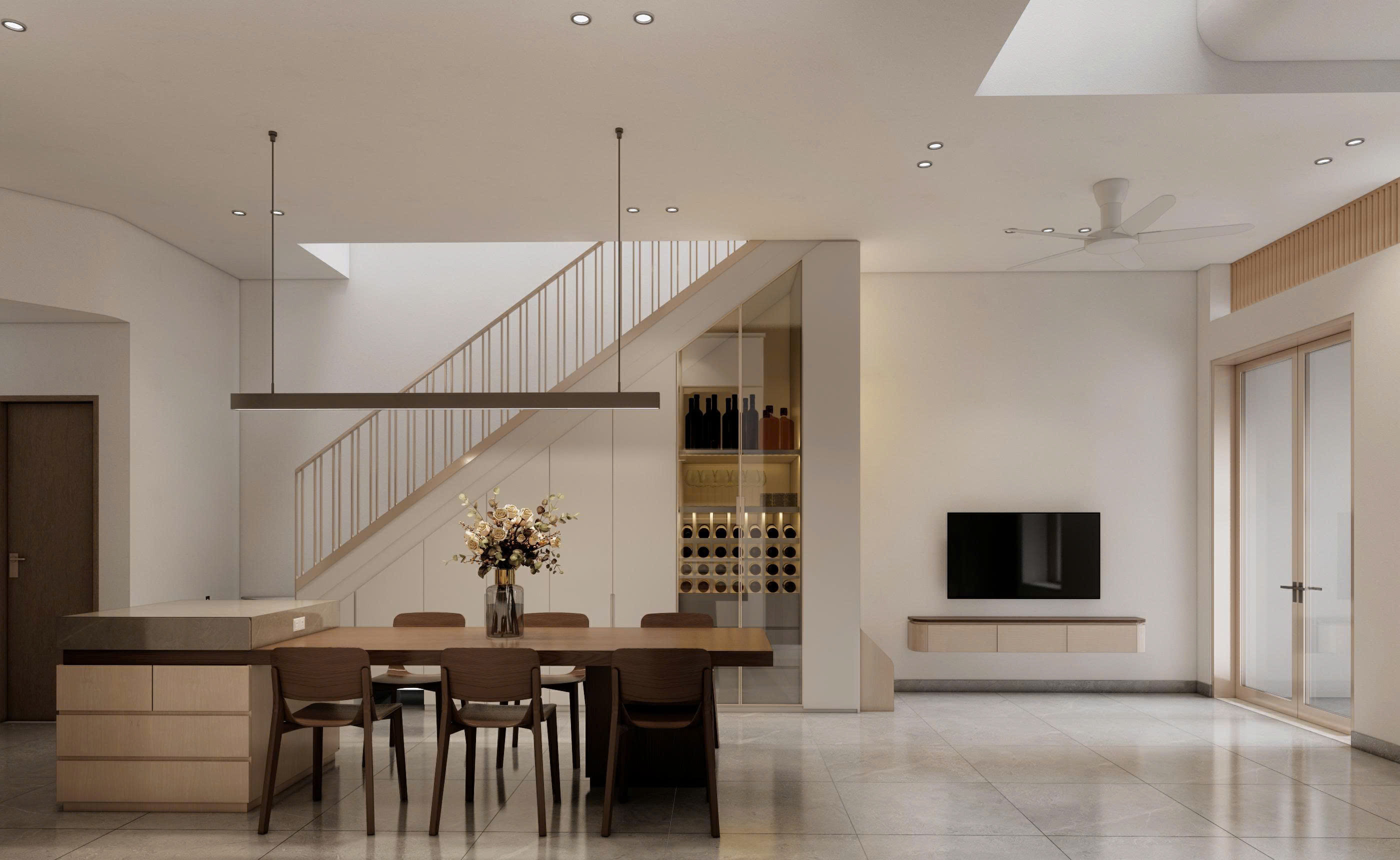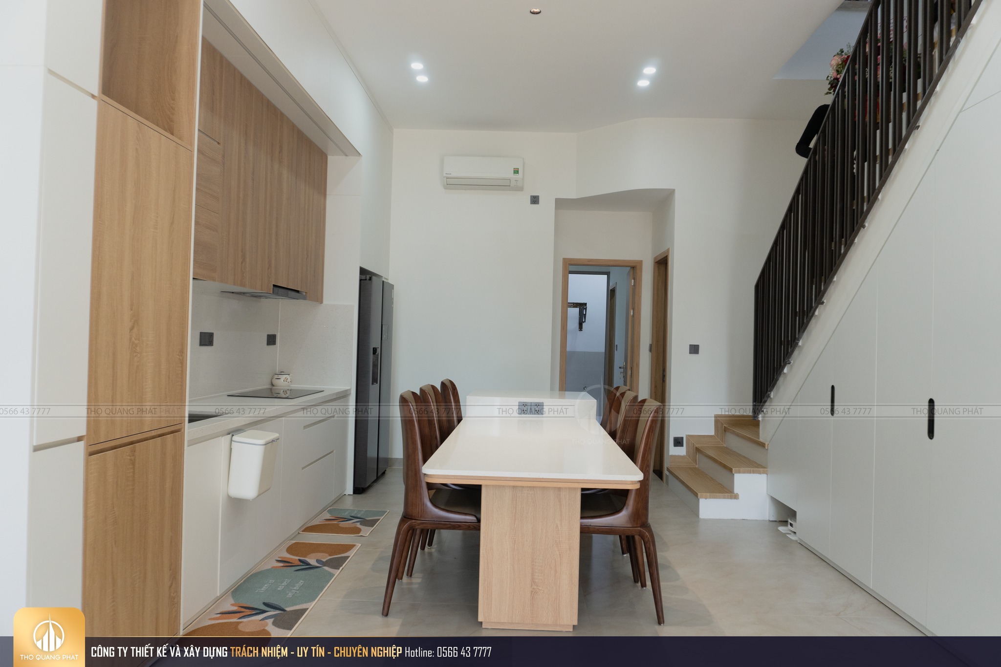 H’s House khéo léo xóa bỏ vách ngăn để kết hợp phòng khách và bếp thành một không gian mở hiện đại, giúp tối ưu diện tích và tăng sự kết nối cho gia đình. Sự hòa quyện giữa nội thất gỗ ấm cúng và tông trắng tinh tế tạo nên một tổng thể sang trọng, sẵn sàng chào đón những bữa cơm tất niên ấm áp.