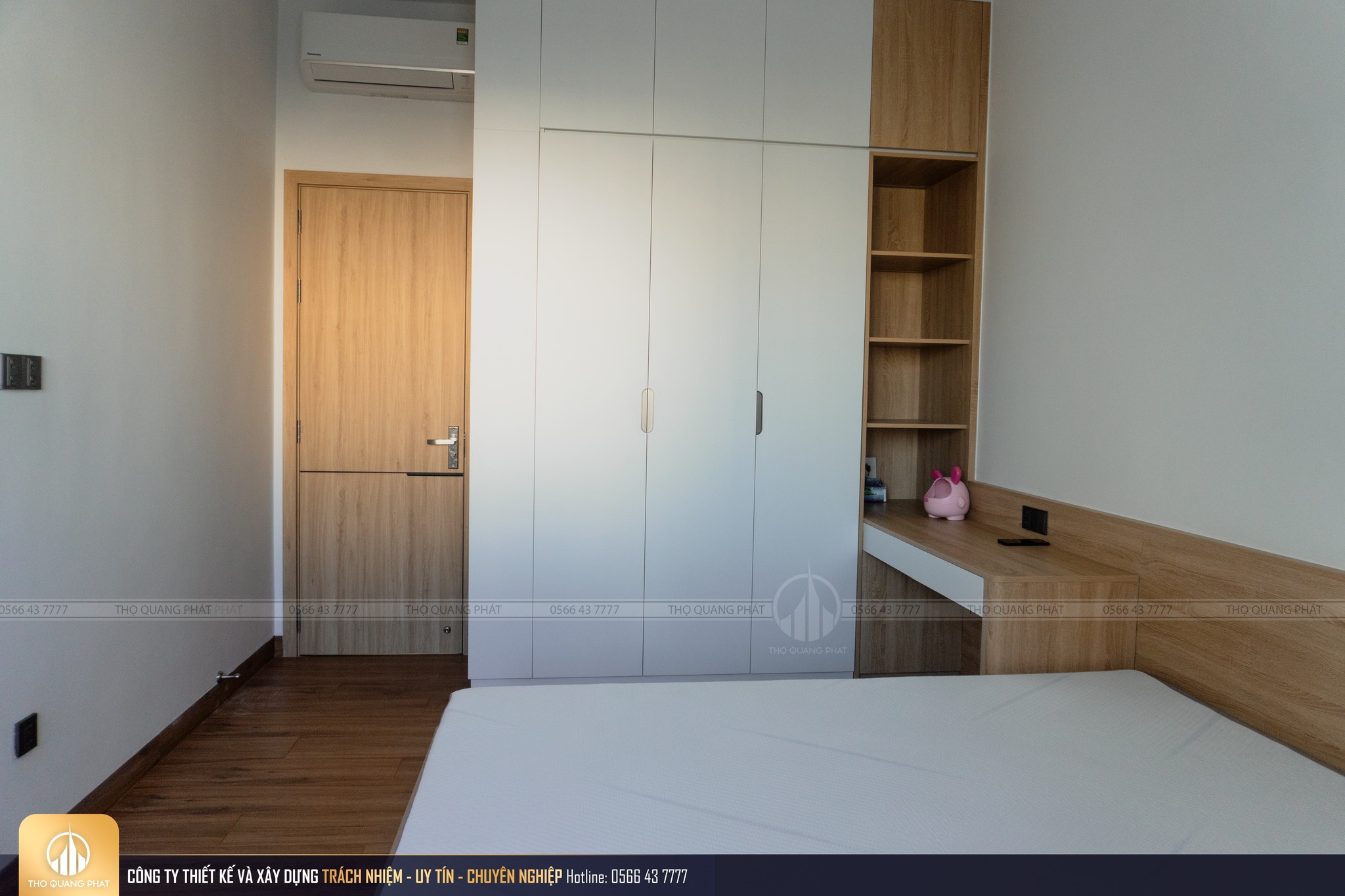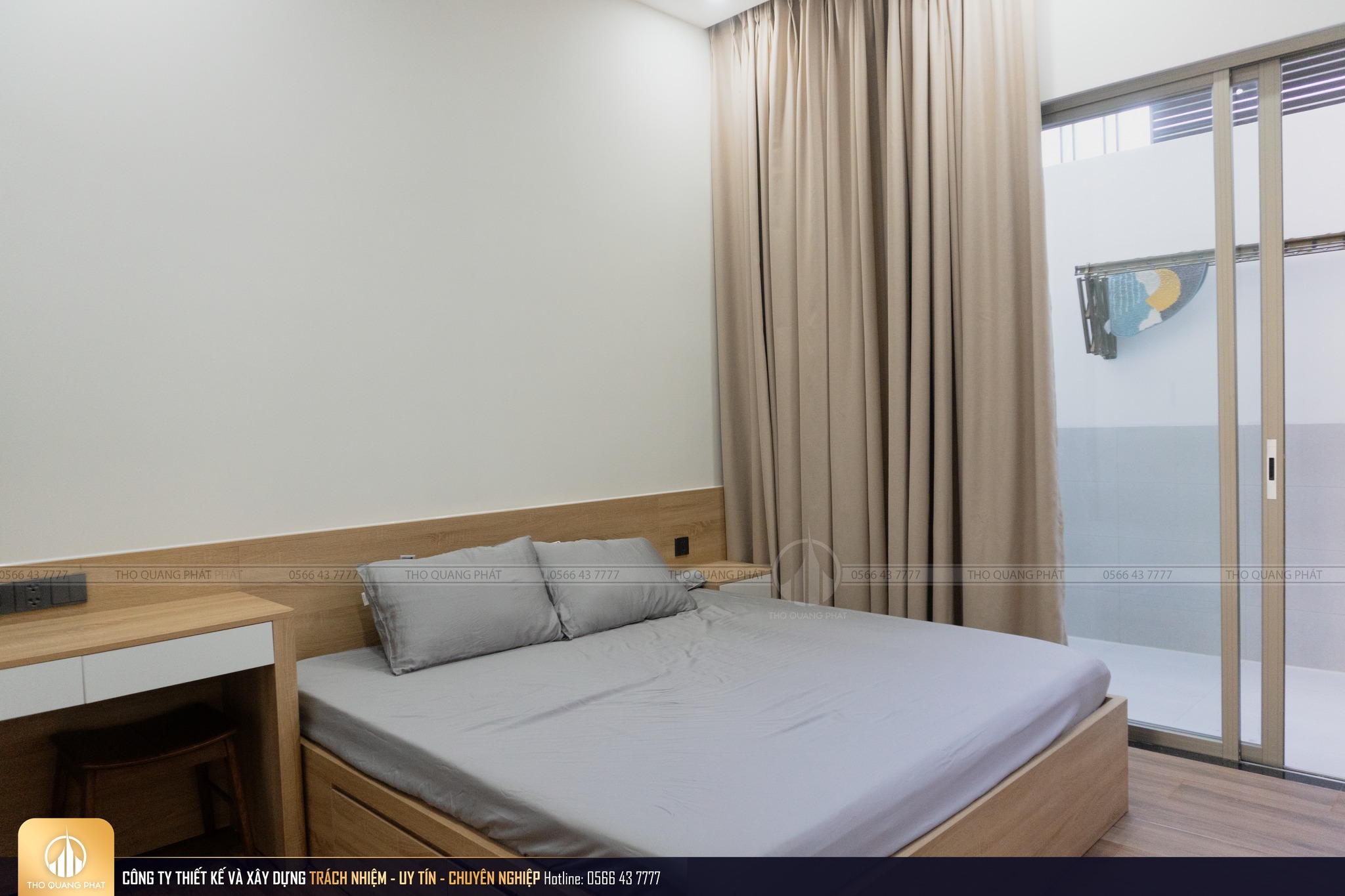 Phòng ngủ H’s House thiết kế tối giản với tủ kịch trần và bàn làm việc liền kề, kết hợp khu giặt sấy thông minh tại ban công có mái che, tối ưu sinh hoạt và ánh sáng tự nhiên.