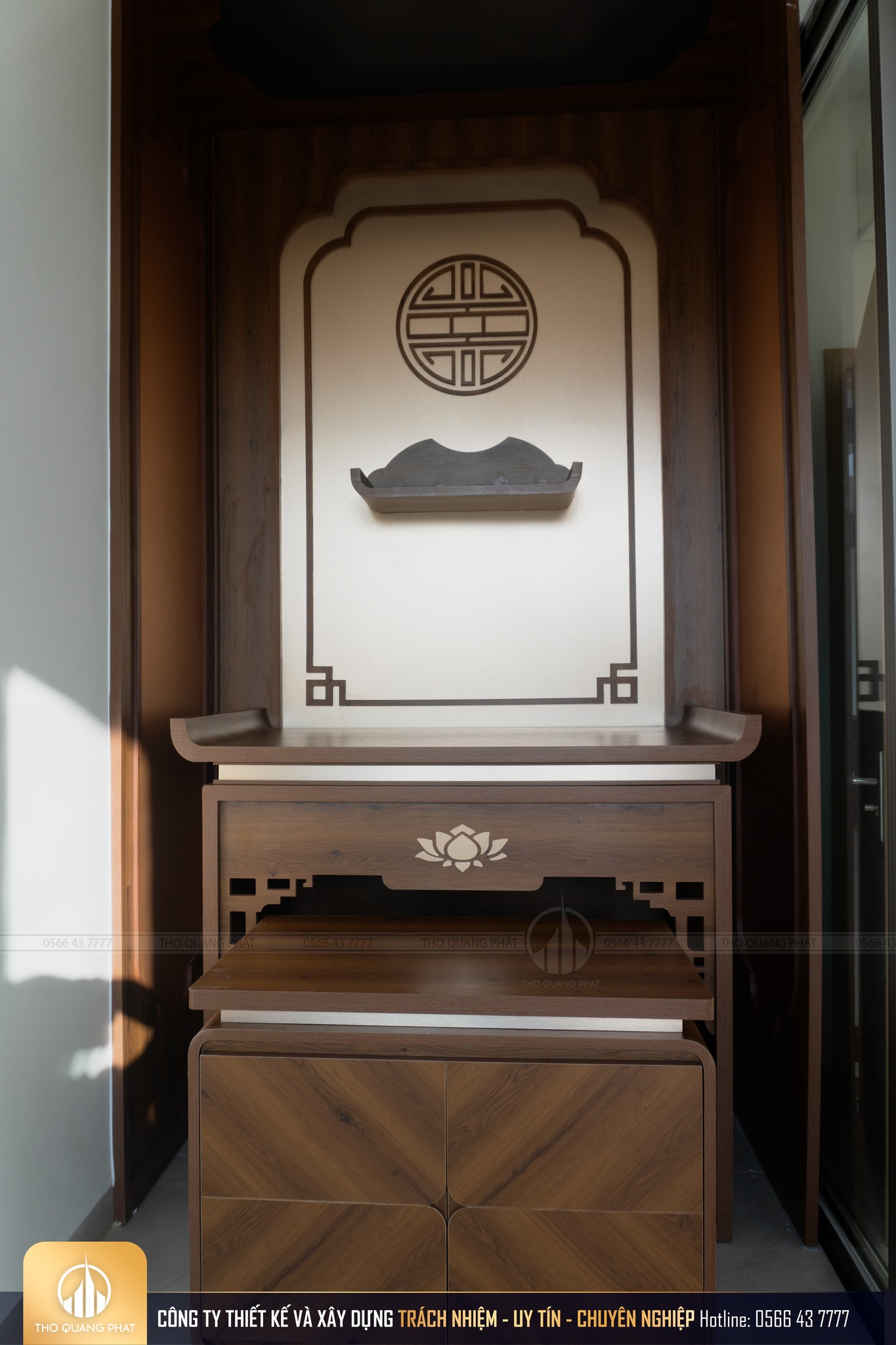 Góc thờ tại H’s House được thiết kế trang nghiêm, tích hợp khéo léo vào hệ tủ gỗ hiện đại để đảm bảo sự tinh tế và riêng tư. Chất liệu gỗ ấm cúng cùng ánh sáng dịu nhẹ tạo nên một không gian tâm linh thành kính nhưng vẫn hài hòa với tổng thể ngôi nhà.