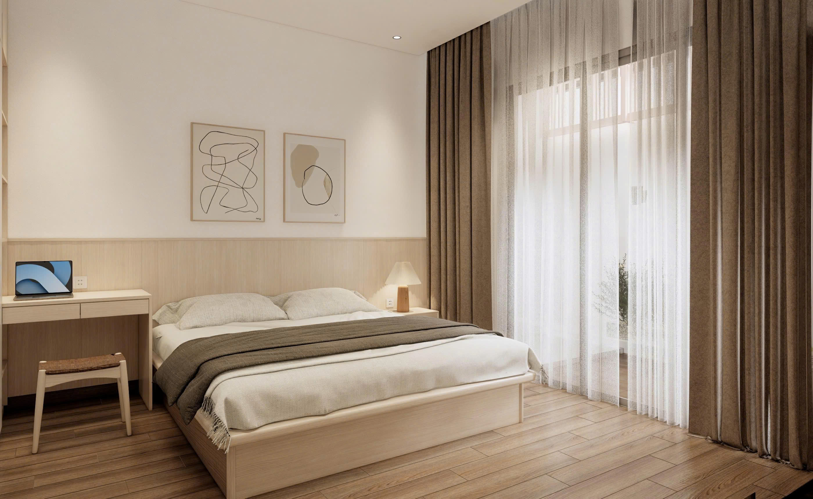 Phòng ngủ H’s House mang phong cách tối giản với nội thất gỗ sáng màu kết hợp hệ tủ kịch trần tinh tế, tạo không gian nghỉ ngơi thoáng đãng và gọn gàng. Căn phòng tối ưu công năng nhờ bàn làm việc tích hợp khéo léo bên cửa sổ lớn, giúp đón trọn ánh sáng tự nhiên và mang lại cảm giác thư thái.