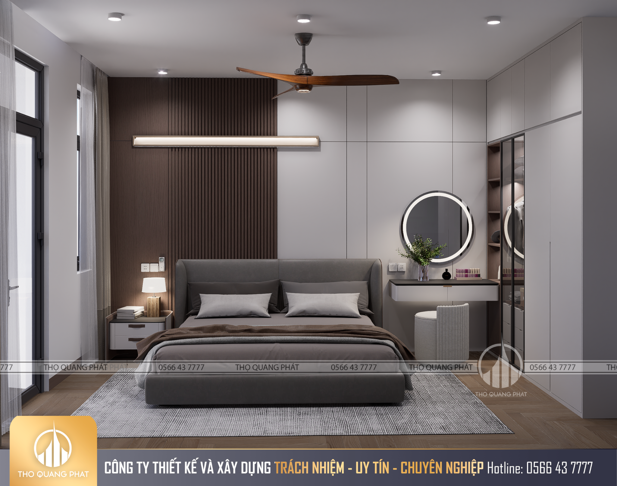 Không gian được đón ánh sáng tự nhiên qua hệ cửa kính lùa hiện đại. Bảng đầu giường ốp gỗ nan dọc, kèm đèn LED ngang tạo điểm nhấn. Nhà phố hiện đại. Tủ quần áo âm tường nối liền bàn trang điểm, tiết kiệm diện tích hiệu quả.Bàn trang điểm treo tường kết hợp gương tròn LED, vừa là điểm nhấn trang trí, vừa phục vụ nhu cầu sinh hoạt cá nhân. Ánh sáng tự nhiên từ cửa sổ lớn kết hợp đèn âm trần giúp phòng luôn sáng và thoáng.