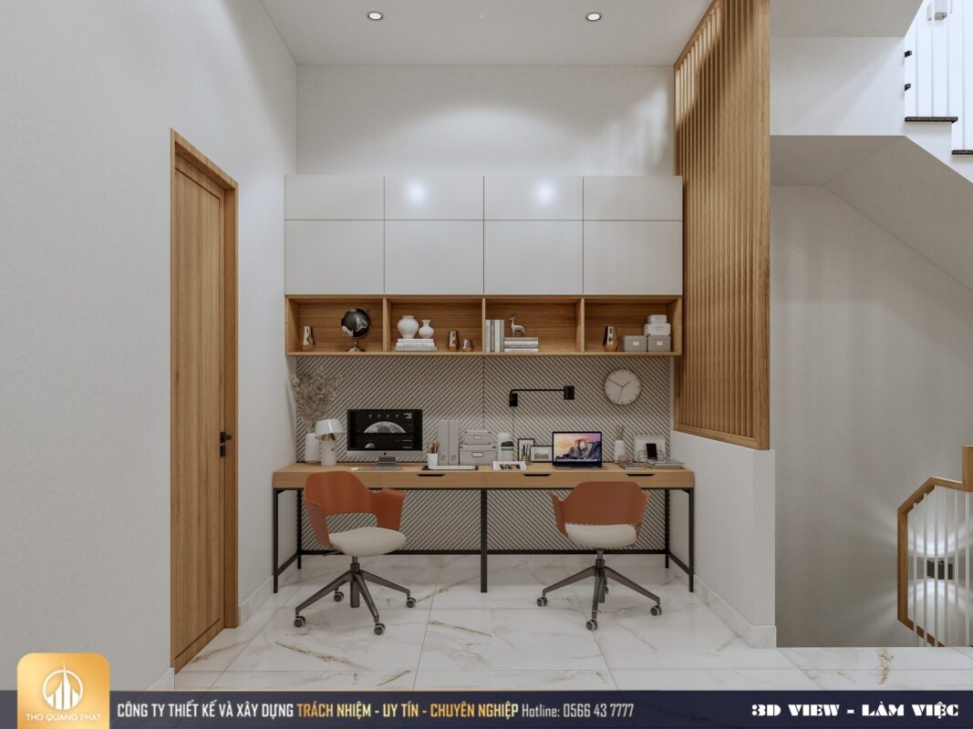 Được thiết kế với 2 bàn làm việc tối ưu tối đa diện tích. Sử dụng màu nâu và trắng làm gam màu chủ đạo.