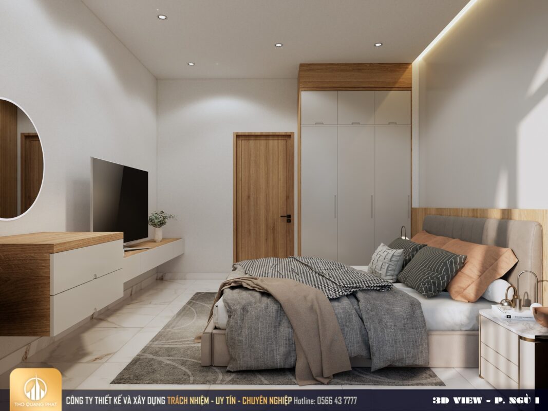 Phòng ngủ có đầy đủ giường, tủ quần áo, tivi, bàn trang điểm vừa tiện nghi, vừa hiện đại.