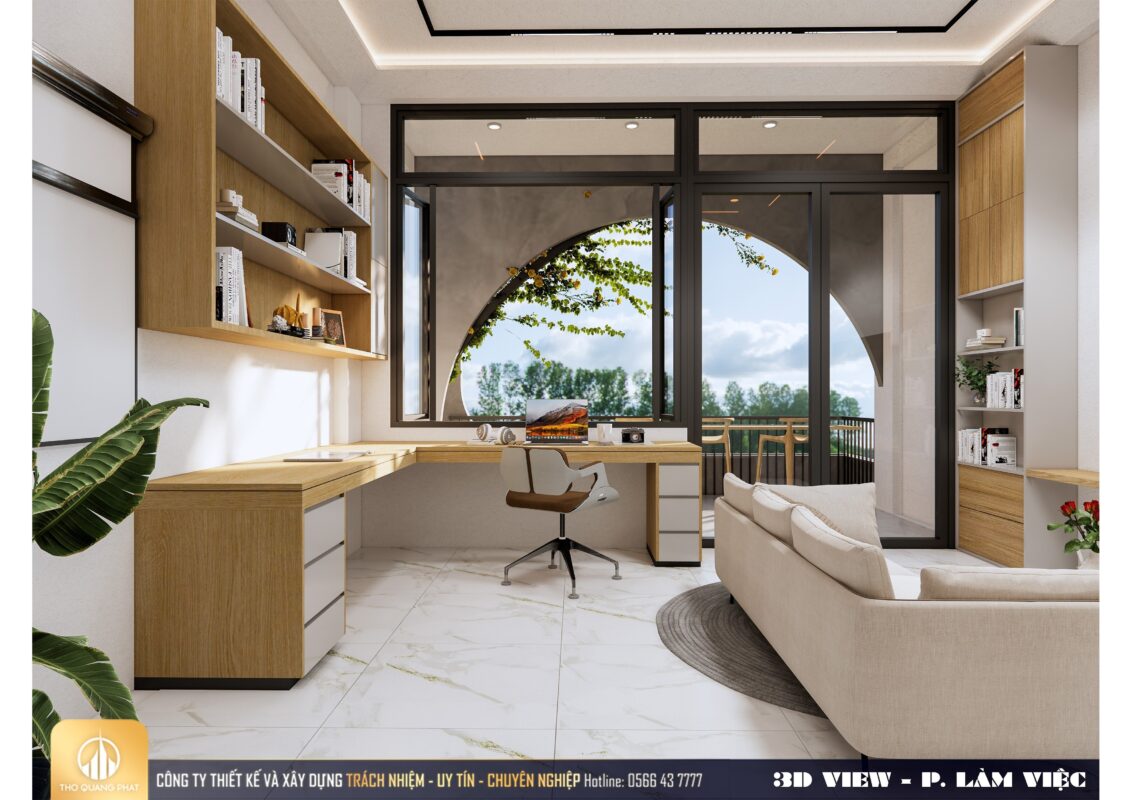 Phòng làm việc vừa có bàn làm việc chữ L hướng ra ban công tạo cảm giác thoải mái khi làm việc. Vừa có bàn ghế sofa thuận tiện cho việc trao đổi công việc với khách quý.