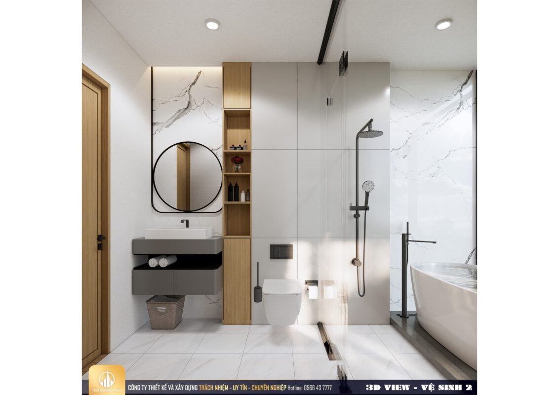 Phòng vệ sinh 2 được thiết kế hiện đại, sang trọng với tông màu trắng chủ đạo kết hợp các điểm nhấn gỗ và màu đen. Khu vực lavabo sử dụng gương tròn viền LED và kệ tủ nhỏ gọn. Bên cạnh đó, bồn tắm nằm thanh lịch được đặt sát tường ốp đá vân mây, tăng thêm vẻ tinh tế và giúp không gian thêm thoáng đãng và thư giãn.